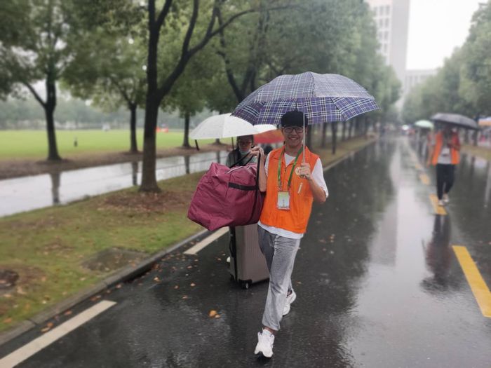 在学校各个门口、咨询服务点、各学院报到处、新生宿舍,随处可以看到我校迎新志愿者们忙碌的身影,他们为新生提供校园引导、报到咨询、行李运送、临时休息等新生服务。他们身上的志愿者服装、志愿者证件,如一面面高高飘扬的旗帜,指引着新生同学们。在各车站,志愿者们在出站口迎接着师弟师妹们;在校园路口,志愿者们撑着伞为新生指路,带领他们去迎新点办理报到手续;在迎新点,志愿者们帮助新生完成报到流程,帮助他们搬运行李,为他们提供便利。