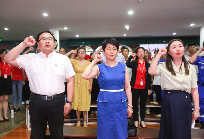 刘晓冬带领党员们重温入党誓词:“我志愿加入中国共产党,拥护党的纲领,遵守党的章程,履行党员义务,执行党的决定……”馆内,党员们高举右拳,在党旗前宣誓,声音久久回响。